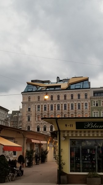 An older building with a much more modern extension built on top, something Mr. Eizinger pointed out all over.